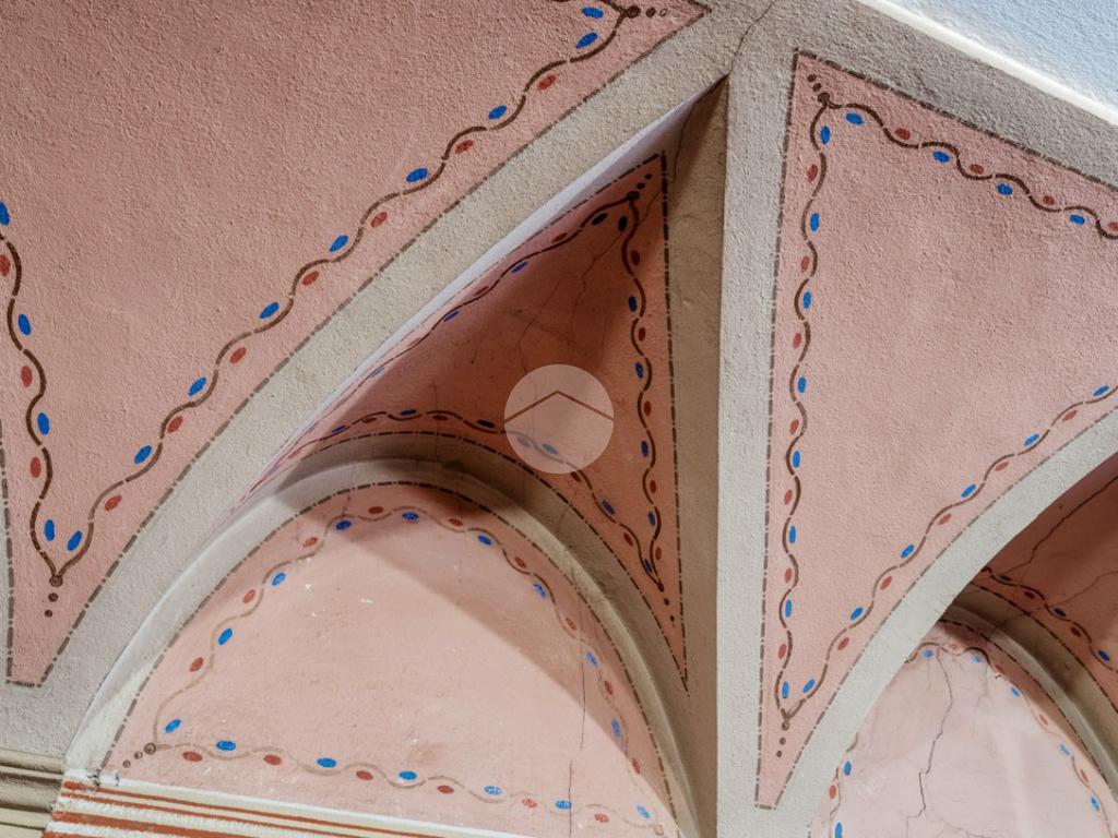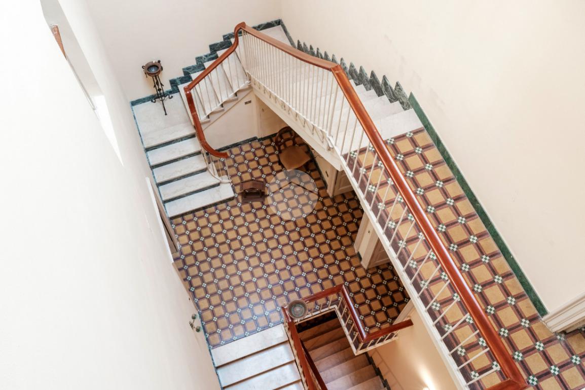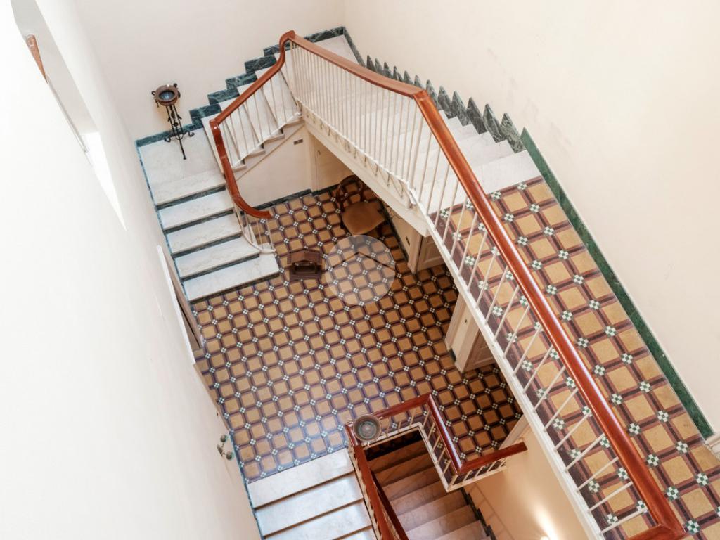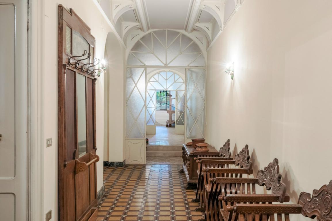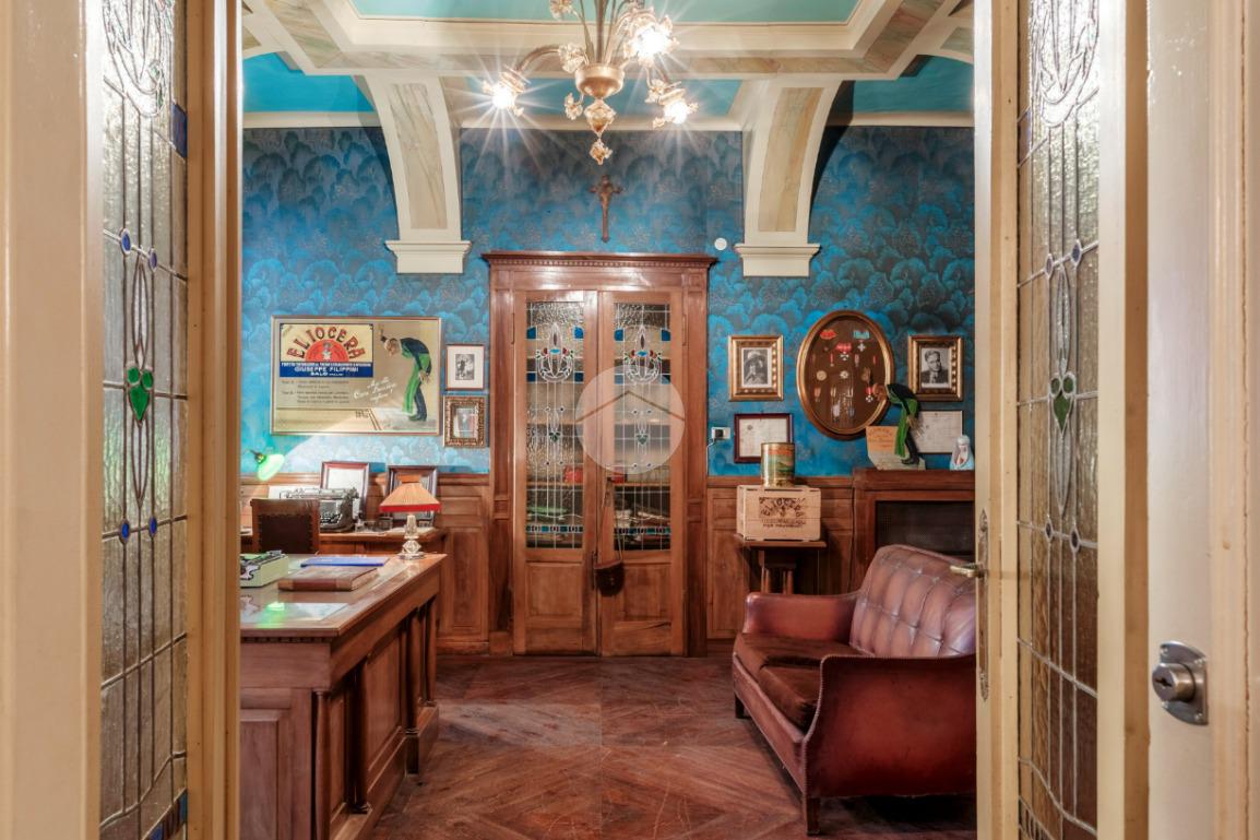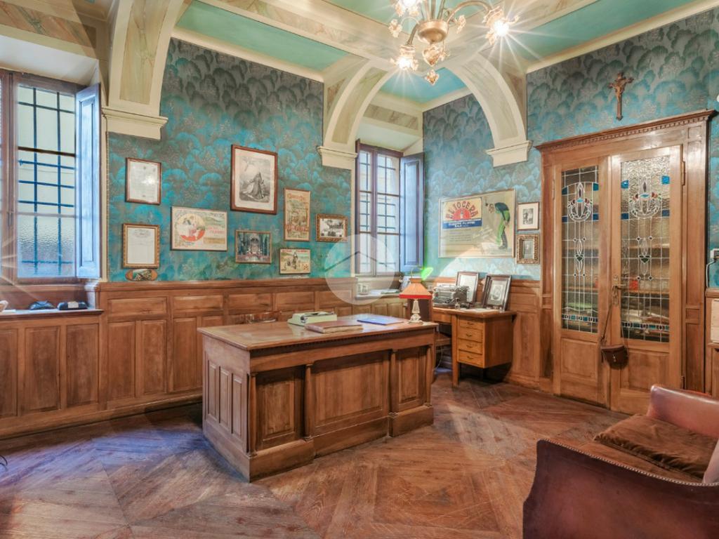 Dal primo piano si accede inoltre a una terrazza di circa 180 mq, affacciata sul verde del giardino, ideale per momenti di rappresentanza e quiete. Il piano terra, storicamente destinato alle attività operative della proprietà, conserva un’anima più funzionale e “industriale”, pur non rinunciando a sale finemente decorate e soffitti affrescati.